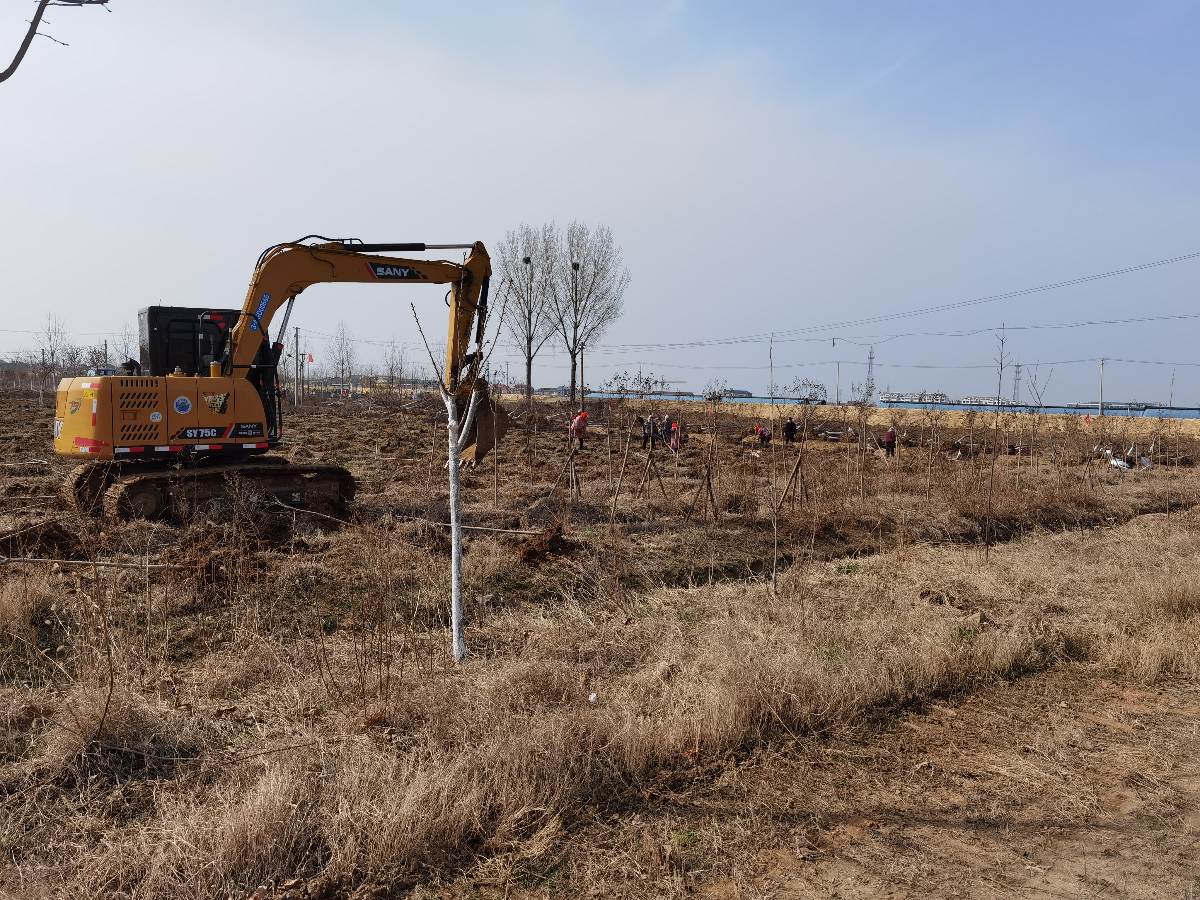 在石梁河水库生态修复项目的施工现场,机声轰鸣,在现场管理人员的有序调配下,20多台大型机械和100多名工人正在进行场地清表、整平和绿化苗木移栽等工作,施工现场各种机械及运输车辆往来穿梭,一派热火朝天的景象,复工建设掀起了小高潮。