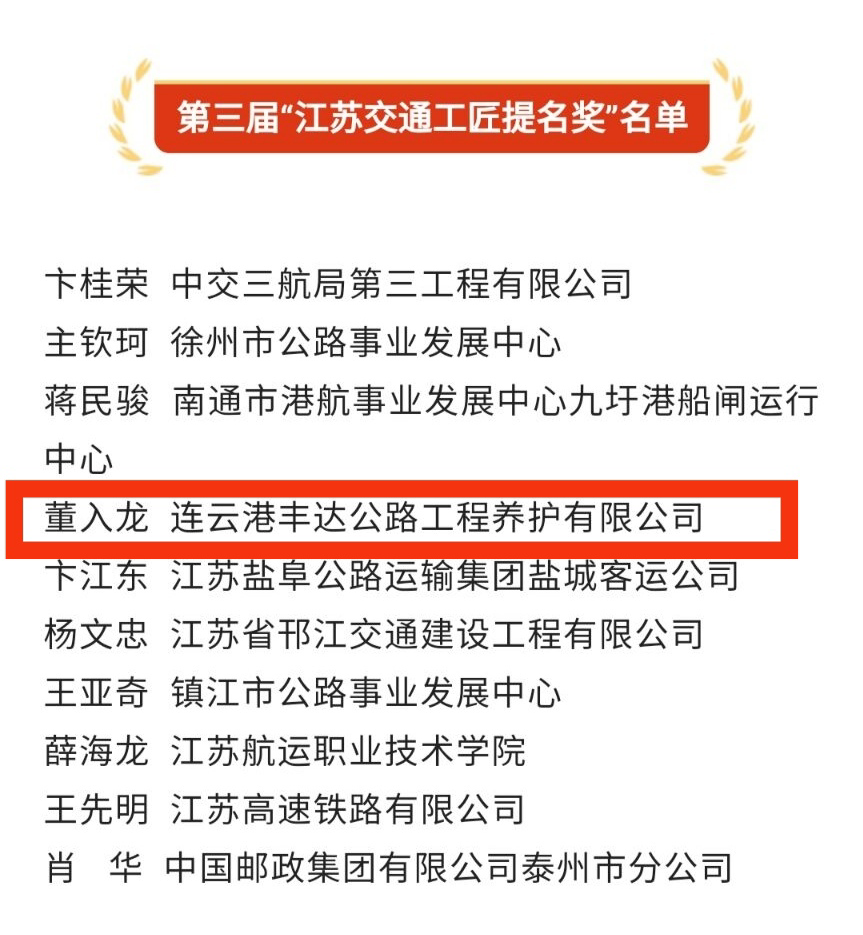 近日,江苏省交通运输厅发文公布第三届“江苏交通工匠”名单。连云港丰达公路工程养护有限公司道路施工项目部经理董入龙荣获“江苏交通工匠提名奖”。