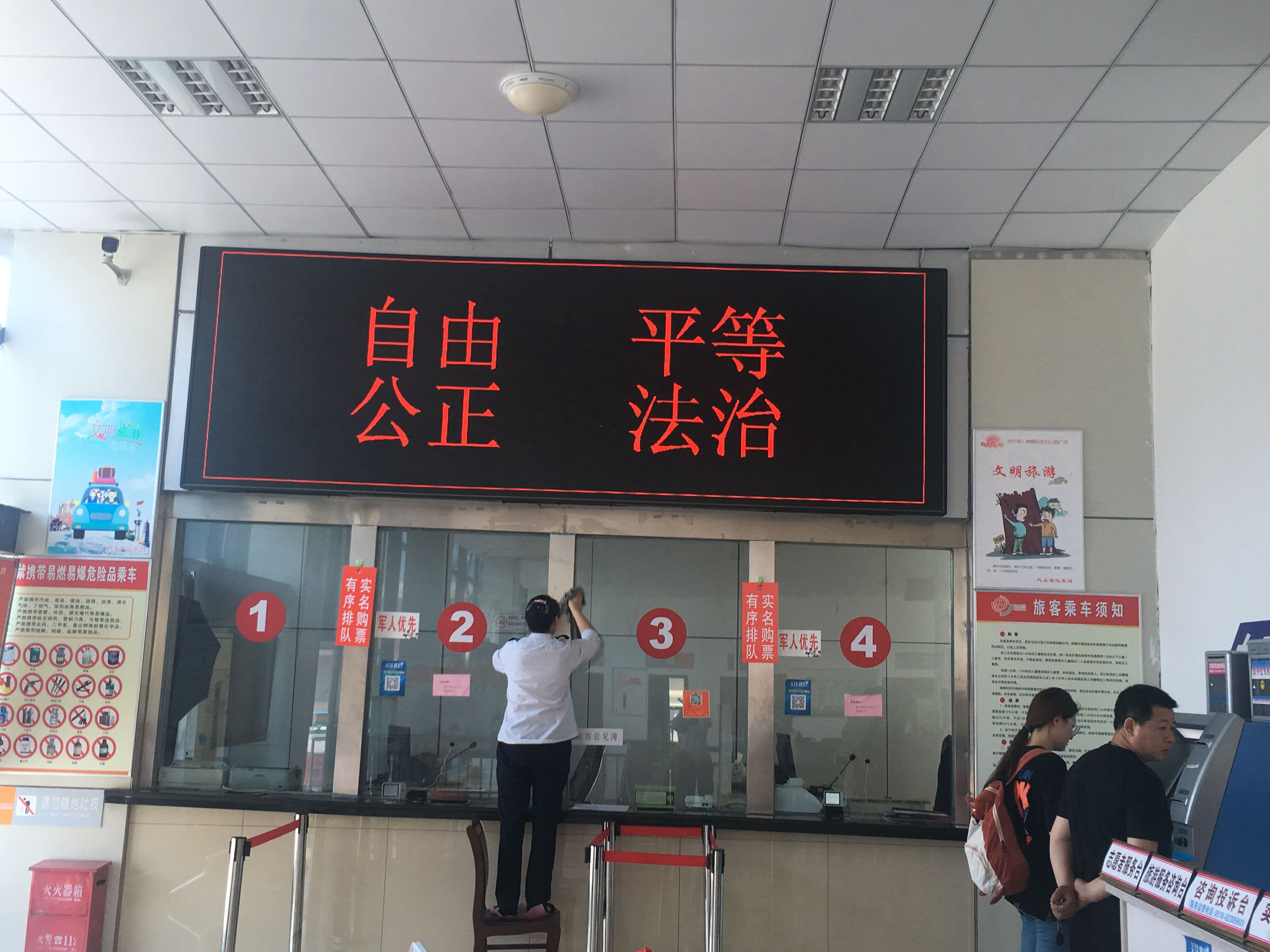 活动对清洗区域进行划分,党员干部和站务人员分工协作,一班组负责站前广场和进站口的玻璃,二班组负责发车区和检票口的玻璃,大家按照分组拿起工具,加入擦玻璃净环境的行动中。大家配合有序,有的拿抹布,有的拿水盆,充分发扬不怕脏、不怕累的优良作风和团结协作的精神,经过将近1个小时的的共同努力,客运东站的玻璃被清理的干干净净,焕然一新。