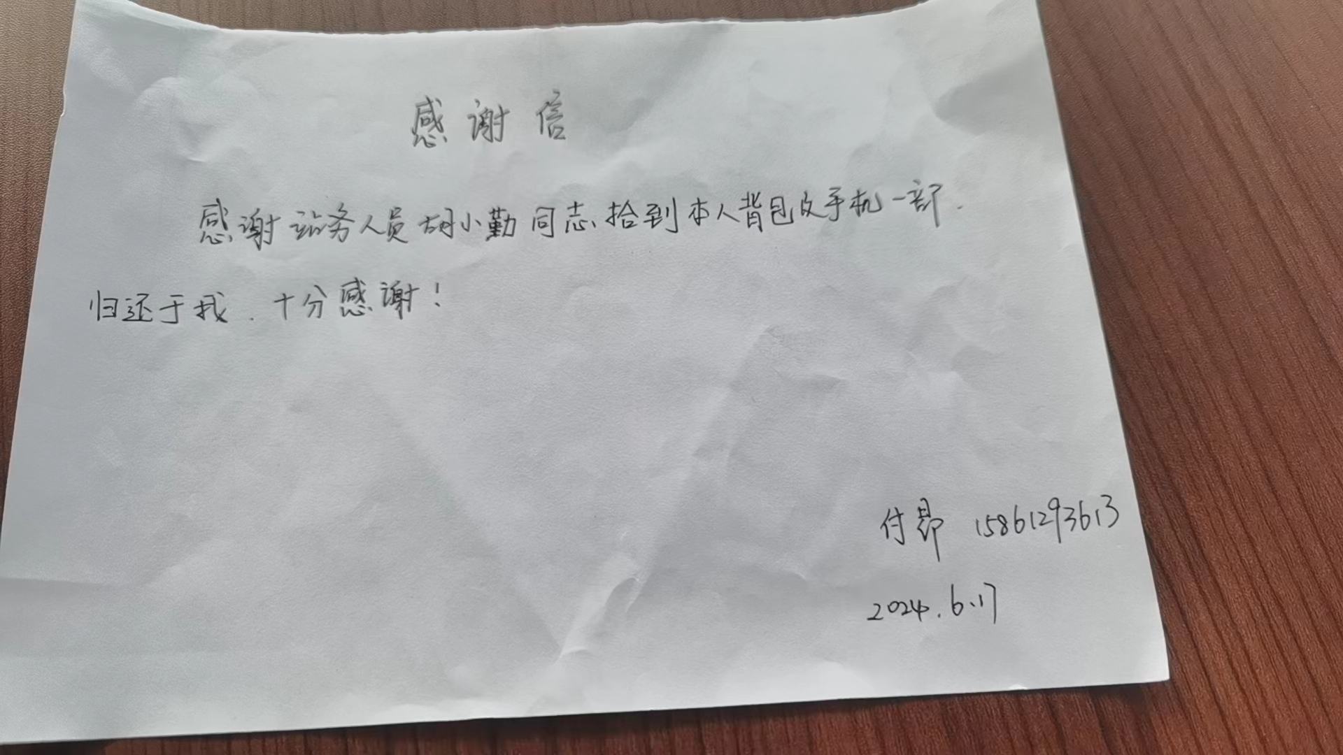 在服务台前,付先生接过胡小勤递过来的背包,紧张焦虑的心情终于平复,并连声向胡小勤和车站工作人员道谢。