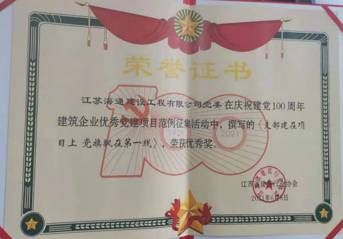 近日,由江苏省建筑行业协会组织开展的江苏省建筑企业党建工作经验交流会在苏州市顺利举办。会议现场发布了省建筑企业优秀党建项目获评名单,共106家企业入选,连云港交控乐鱼app最新版下载,乐鱼(中国)权属江苏海通建设工程公司党委报送的党建项目范例《支部建在项目部 党旗飘在第一线》,荣获优秀奖。