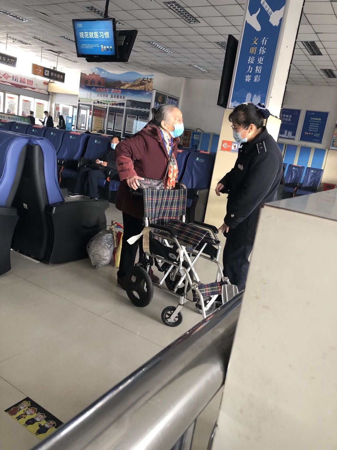 钟海涛通过了解,得知老人已经90岁高龄,目前居住在儿女家接受照料。因受疫情影响,长期未回老家,思乡之情日益浓厚,虽然行动不便,但老人坚持要独自乘车返乡。钟海涛体谅老人返乡心切、想早点上车的心情,立即返回服务岗位,推来“爱心轮椅”,一路护送并帮助老人坐上大巴车,叮嘱司机路上给予特殊关照。体贴入微的服务,让老人感受到了儿女般的温暖。上车后,老人连声感谢钟海涛,表示以后还来车站乘车。
