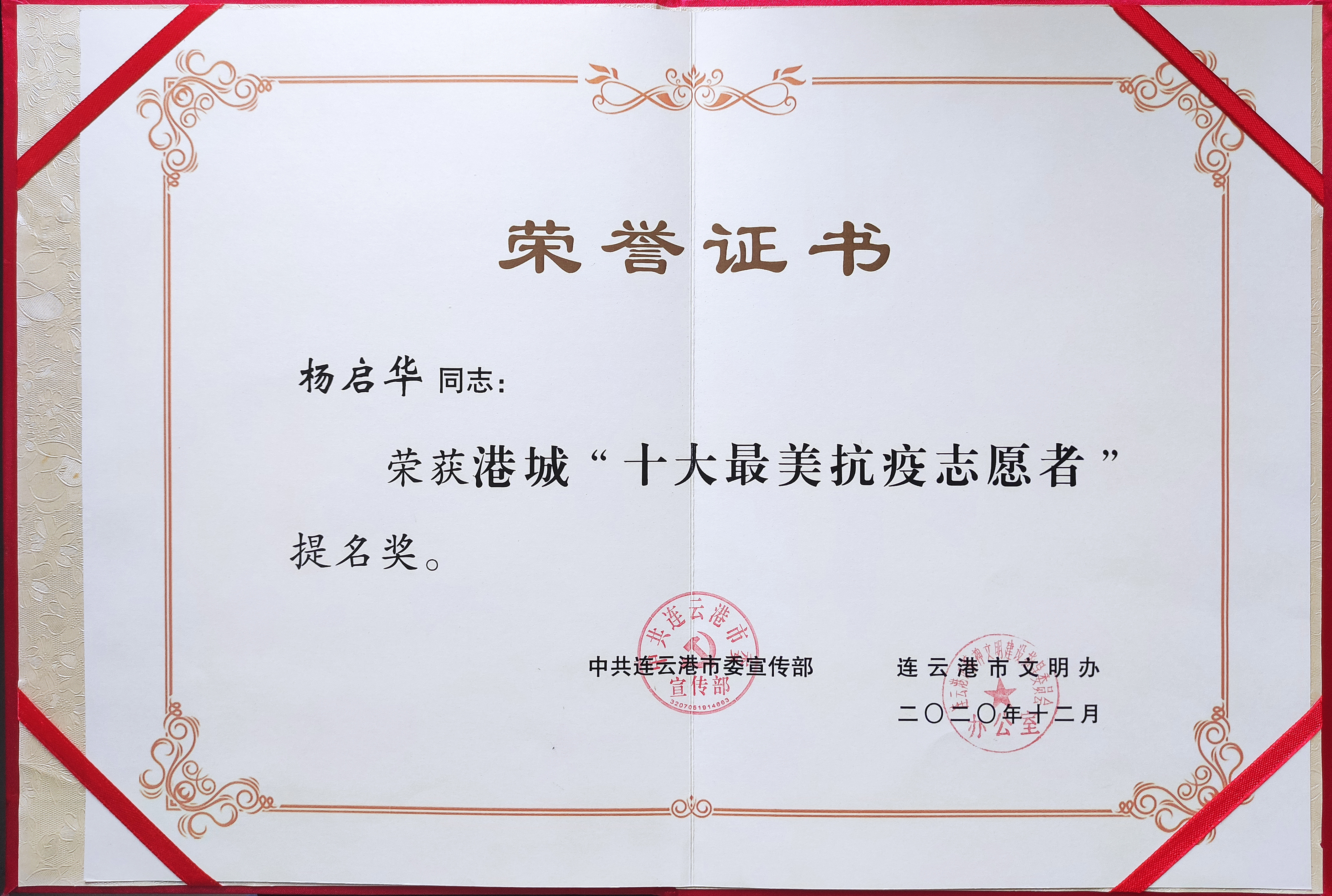 日前,经中共连云港市委宣传部、连云港市精神文明建设指导委员会办公室组织发动、推荐申报、专家评审等程序,连汽快客公司驾驶员杨启华获港城“十大最美抗疫志愿者”提名奖。