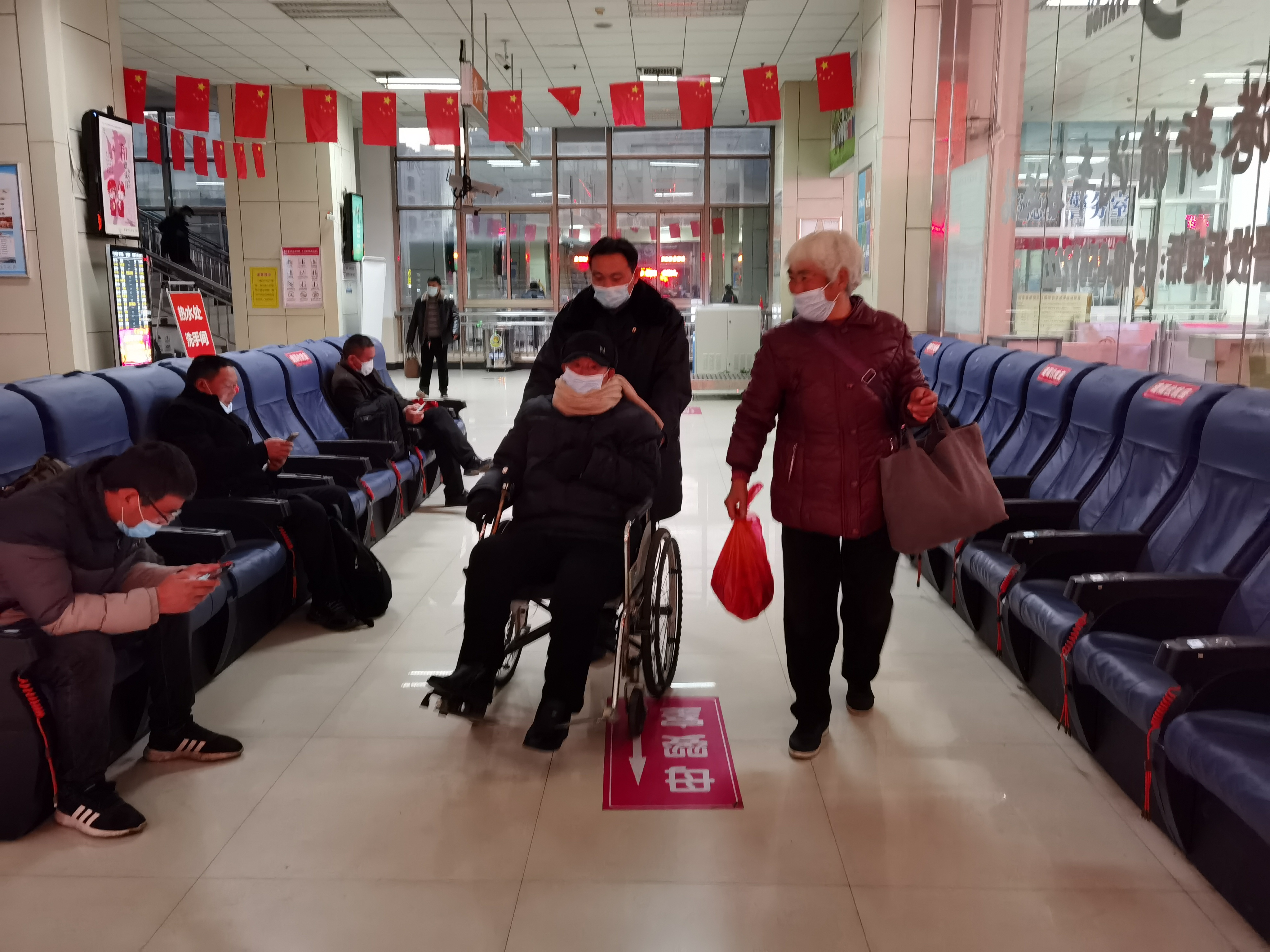 12月7日早7点,汽车站售票大厅内,一位头发斑白的老太太正吃力地推着一辆轮椅,轮椅上坐着一位白发苍苍的老大爷。