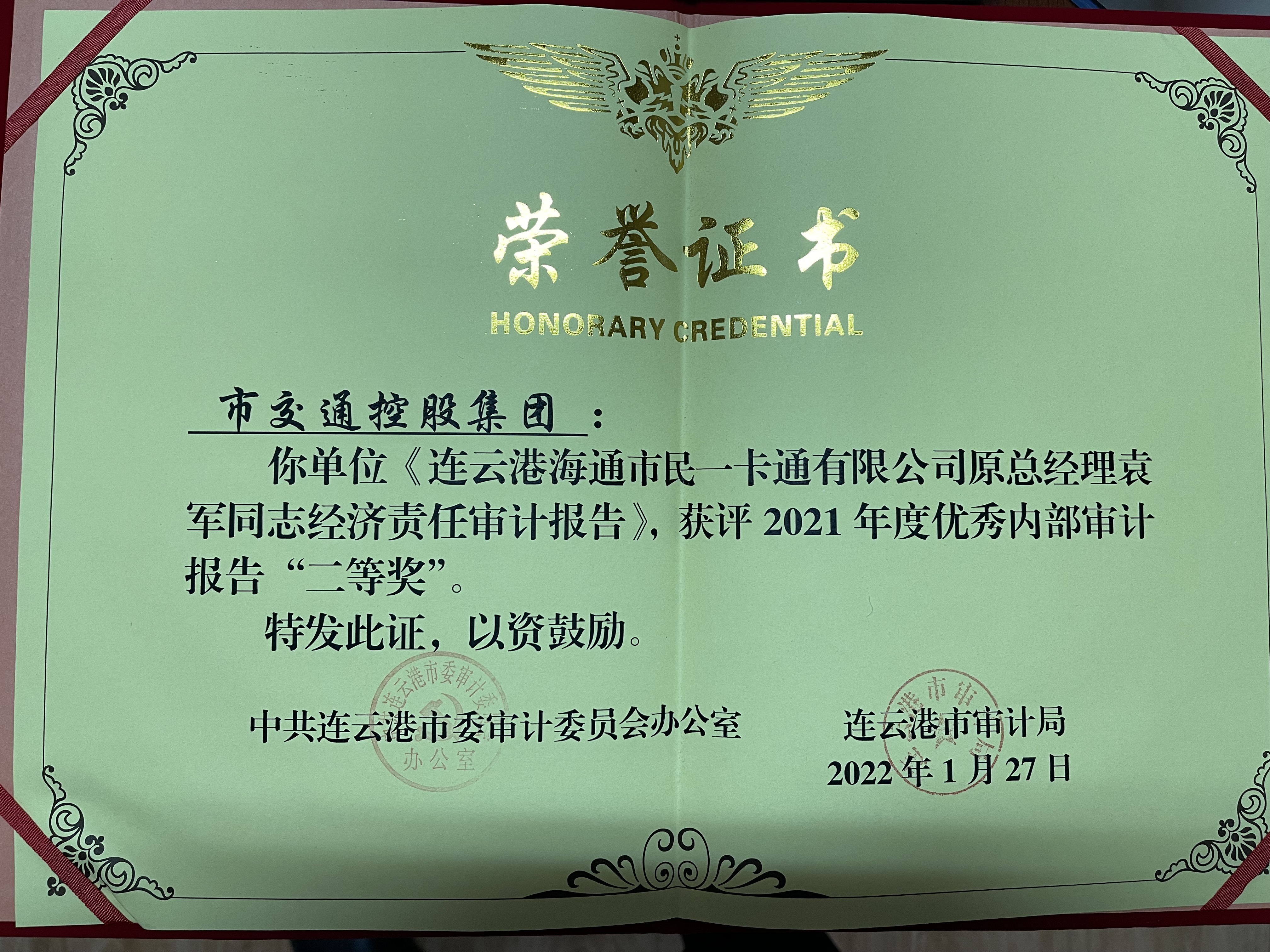 近日,乐鱼app最新版下载,乐鱼(中国)审计部出具的审计报告——《连云港海通市民一卡通有限公司原总经理袁军同志经济责任审计报告》,在审计局组织有关人员对2021年度全市内部审计报告开展评选工作中获得连云港市委审计委员会和连云港市审计局共同颁发的2021年度优秀内部审计报告“二等奖”。