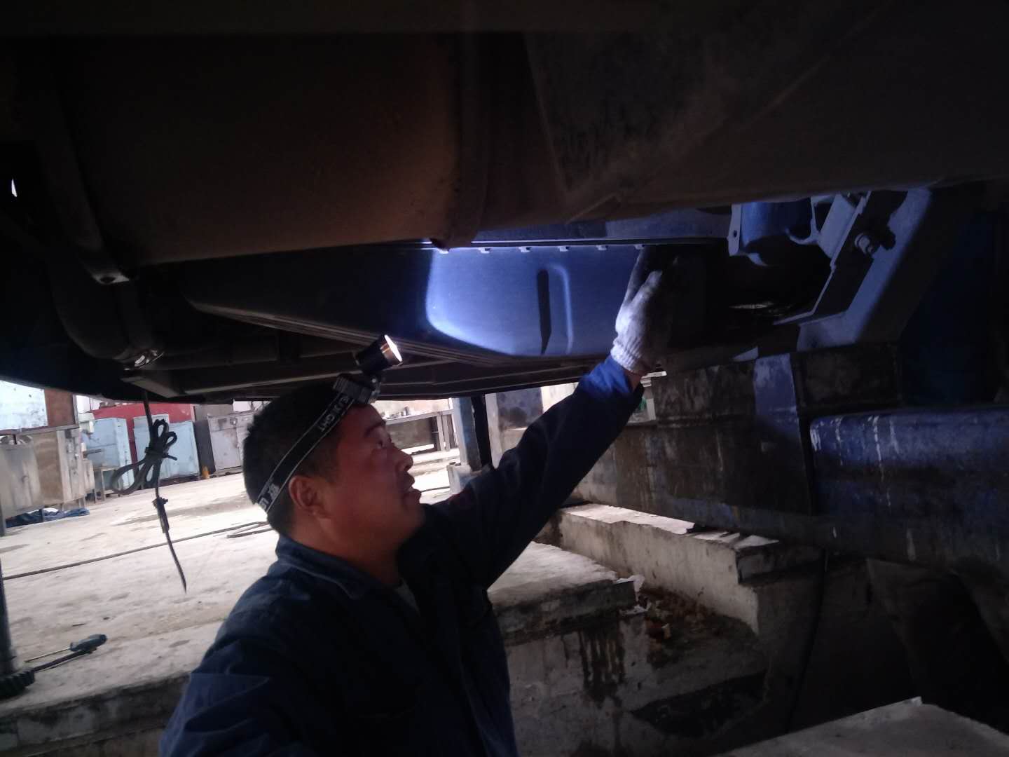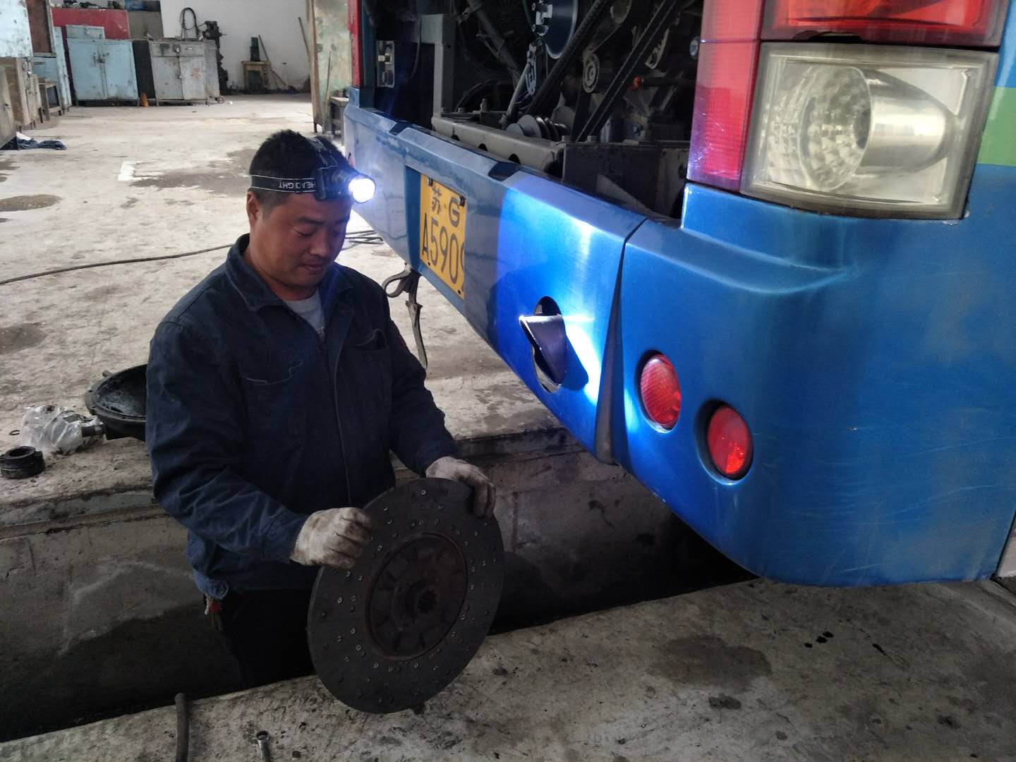 地沟只有几十厘米宽,半人高,而且光线很暗,刘长伦佝偻着身子,带着工作灯,钻了进去,为了吊变速器,修离合器,他得常常半蹲在一块板上,弯着腰,将上半身探进车底维修、保养车辆,短暂地结束工作从地沟钻出来时,手上、身上已经满是机油和污垢。对于这样的状态,刘长伦习以为常,他每天进入车间的维修车辆有40台次左右,每个月至少需给七八十辆公交车做二级保养,修理工每天6:30上班,20:30下班,如果遇到紧急维修任务,还得加班加点。炎热的夏季更加难熬,地沟又闷又热,一天下来,每个人沾满油渍的衣服、头发都是湿了又干、干了又湿。遇上修发动机这样的活,为了避免带入杂物,也不能带手套,周边都是金属部件,不小心磕了碰了,在所难免,每个修理工的手上、胳膊上都有工作造成的划伤。