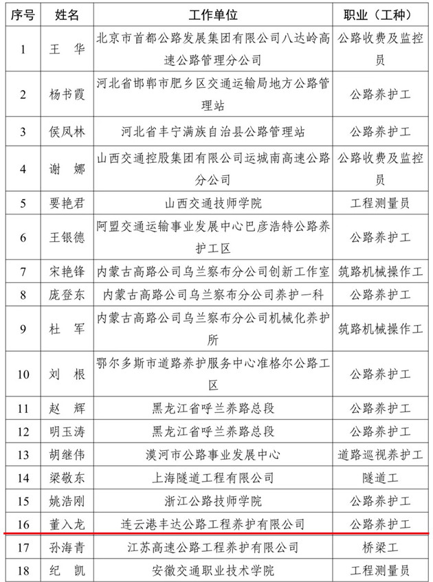 近日,交通运输部公布2021年度全国交通技术能手评审结果,连云港市交通控股乐鱼app最新版下载,乐鱼(中国)丰达养护公司公路养护工董入龙同志荣誉“全国交通技术能手”称号。据悉,全国仅有245名同志获此荣誉。