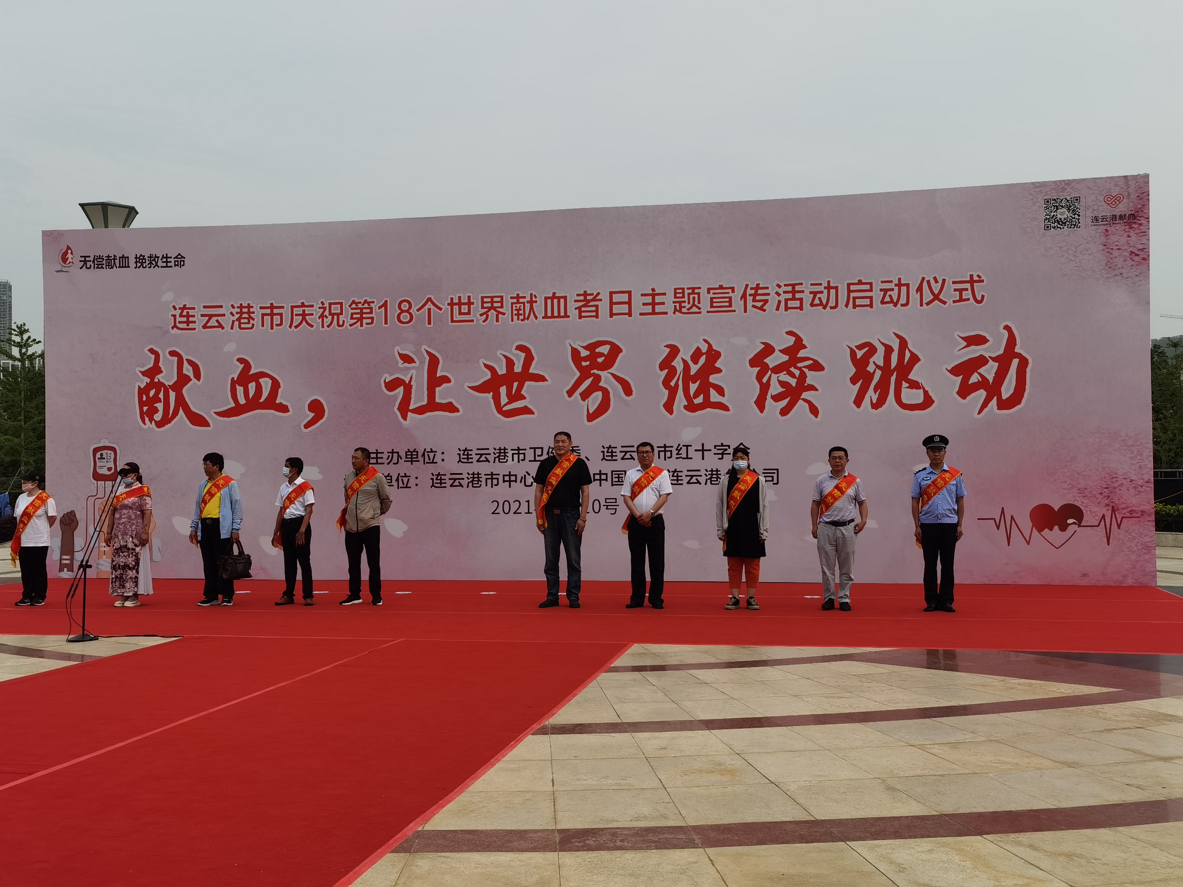连云港市第18个世界献血者日主题宣传活动启动仪式在苍梧绿园举行,为全市无偿献血先进单位代表颁奖,汽车公司副总经理、客运事业部经理董红波荣获2018-2019年度无偿献血奉献奖金奖。