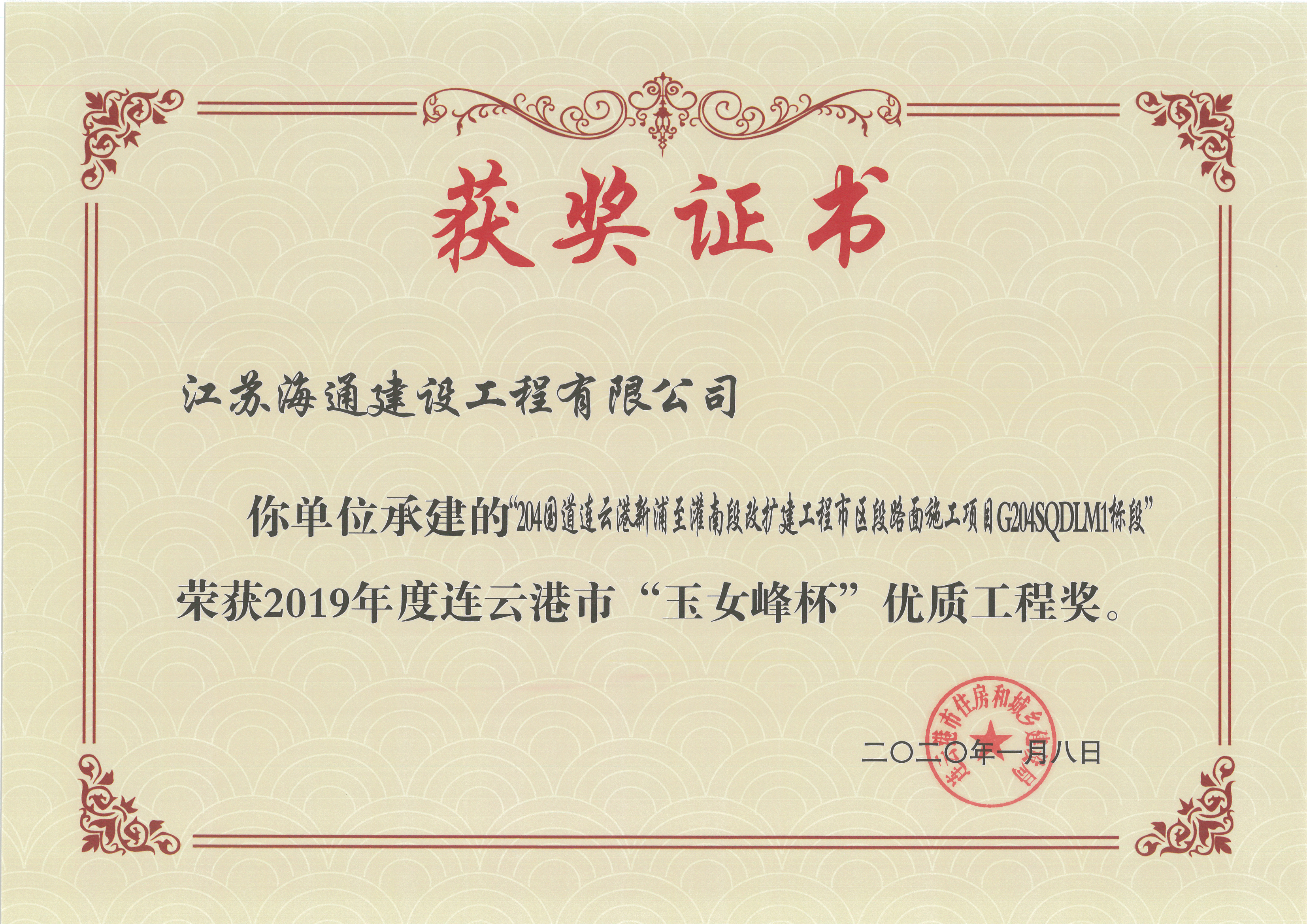 4月23日,连云港市住建局颁发了2019年连云港市“玉女峰杯”优质工程奖奖状。江苏海建公司申报的“204国道连云港新浦至灌南段改扩建工程市区段路面施工项目G204SQDLM1标段”、“204国道连云港市区段G204SQDLQ1标”、“连云港市解放东路(陇海铁路下穿通道-310国道段)整治出新工程施工项目G310CX-SG标段”和“石化七道(港前大道-石化三路)新建工程”四个项目均获得此项荣誉。
