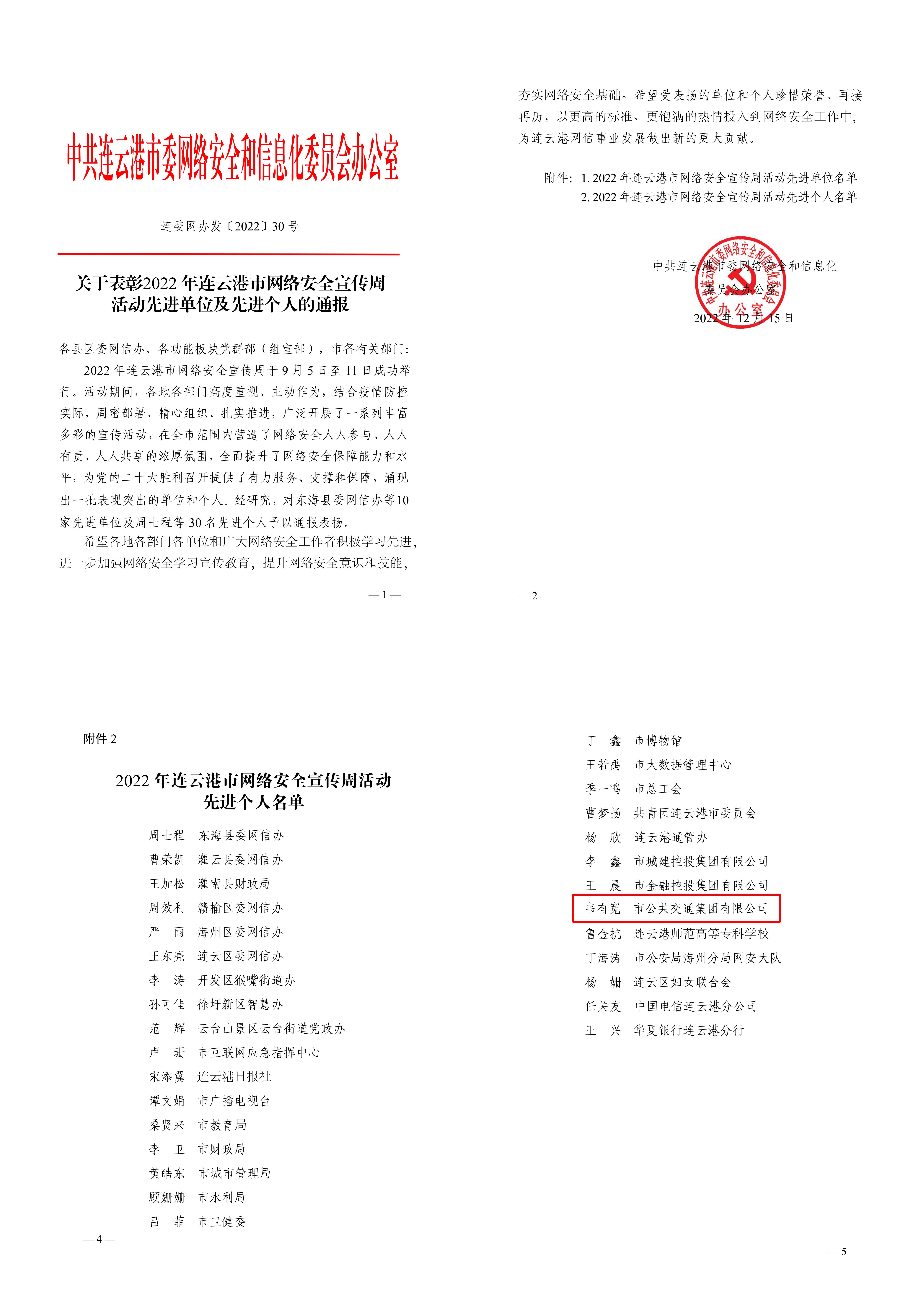 2022年连云港市网络安全宣传周于9月5日至11日成功举行。活动期间,市交通控股乐鱼app最新版下载,乐鱼(中国)权属公交乐鱼app最新版下载,乐鱼(中国)高度重视,主动作为,广泛开展宣传活动,营造网络安全人人参与、人人有责、人人共享的浓厚氛围。公交乐鱼app最新版下载,乐鱼(中国)生产运营部韦有宽在宣传活动中表现突出,获得连云港市网络安全宣传周活动先进个人荣誉称号。