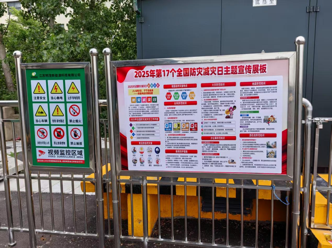 在防灾减灾宣传周期间,明茂公司围绕台风、暴雨、火灾、沙尘暴、地震及泥石流等常见灾害,更新充电场站宣传展板,以图文结合形式展示灾害的防范要点。宣传展板以常见灾害为切入点,台风防范强调“检查门窗密封性、加固户外设备、远离低洼区域”;火灾逃生标注“湿毛巾捂口鼻、弯腰沿墙撤离”等口诀;地震避险突出“伏地、遮挡、抓牢”三步骤。
