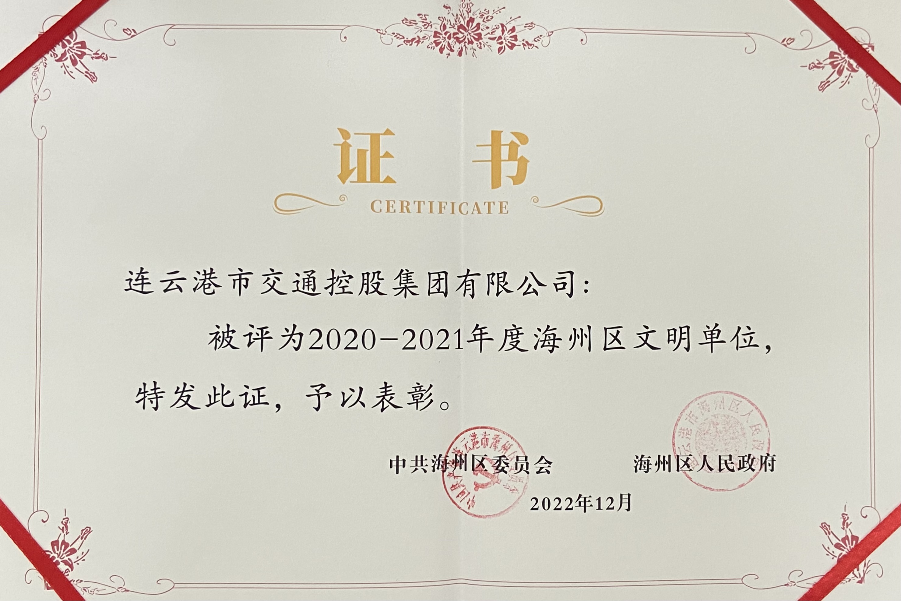 中共连云区委、连云区人民政府授予以下乐鱼app最新版下载,乐鱼(中国)权属单位2020-2021年度连云区文明单位荣誉称号: