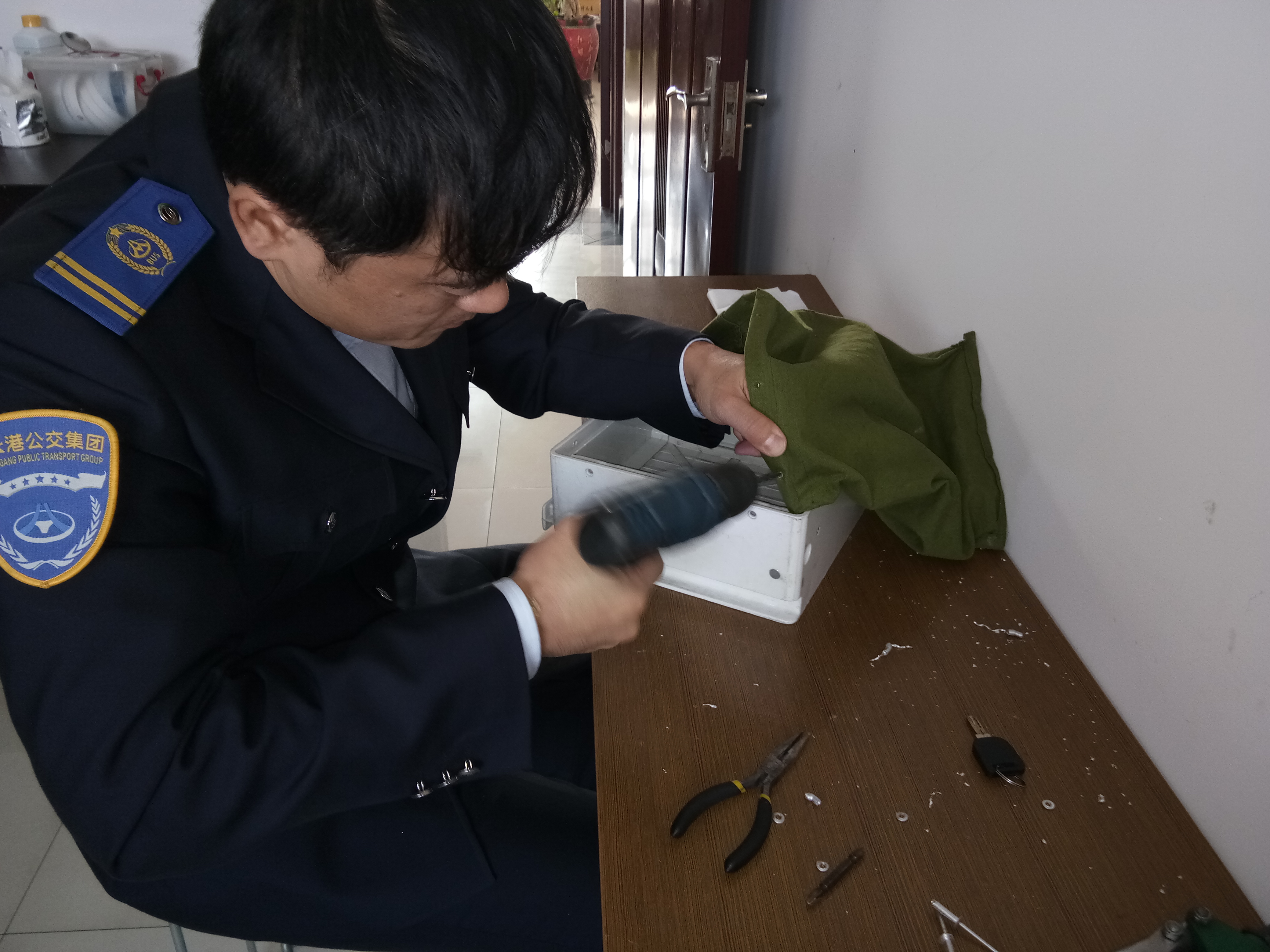 11月1日上午,运营信息科又接到几个坏的投币箱钱袋,运营信息科科长霍昌如凭借以往经验,开始了投币箱钱袋维修工作,首先他用手枪钻将投币箱钱袋四周的铆钉打通,取出四周固定钱袋的铆钉;接着将钱袋从箱体上进行剥离,此时要特别注意挂在布袋四周的铆钉铁削刮伤手;其次拆除钱袋箱体内部盖板部分,取出钱袋箱体内部防盗挡板插销,取出挡板及弹簧,并对弹簧进行修复、调整;最后修复后对钱袋箱体内拆卸下的物品进行复位,同时插入投币箱插板,并进行调试,调试完成后,对投币箱钱袋进行整体复位,使用铆钉枪将钱袋与箱体进行固定,直到投币箱钱袋完整,完成后对整体进行测试,确保投币箱正常使用。