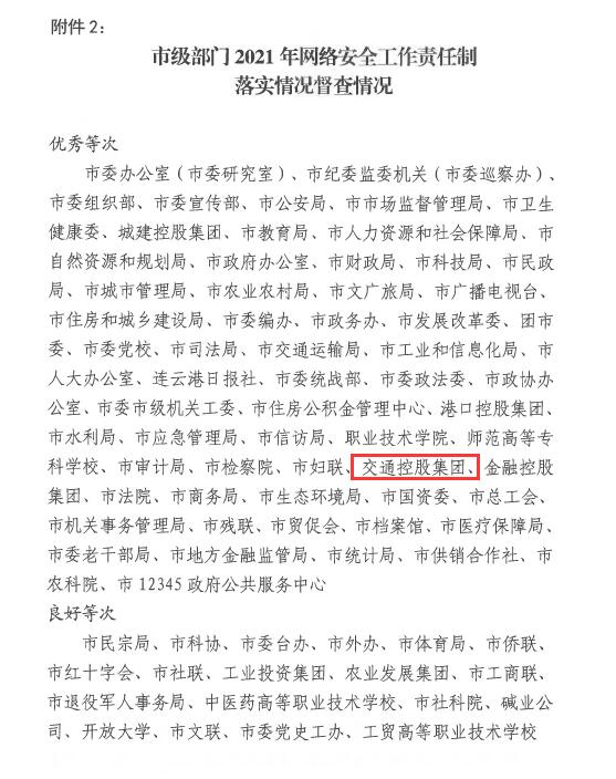 日前,市网信办通报2021年度全市党委(党组)网络安全工作责任制落实情况督查检查结果,乐鱼app最新版下载,乐鱼(中国)被评为优秀等次。