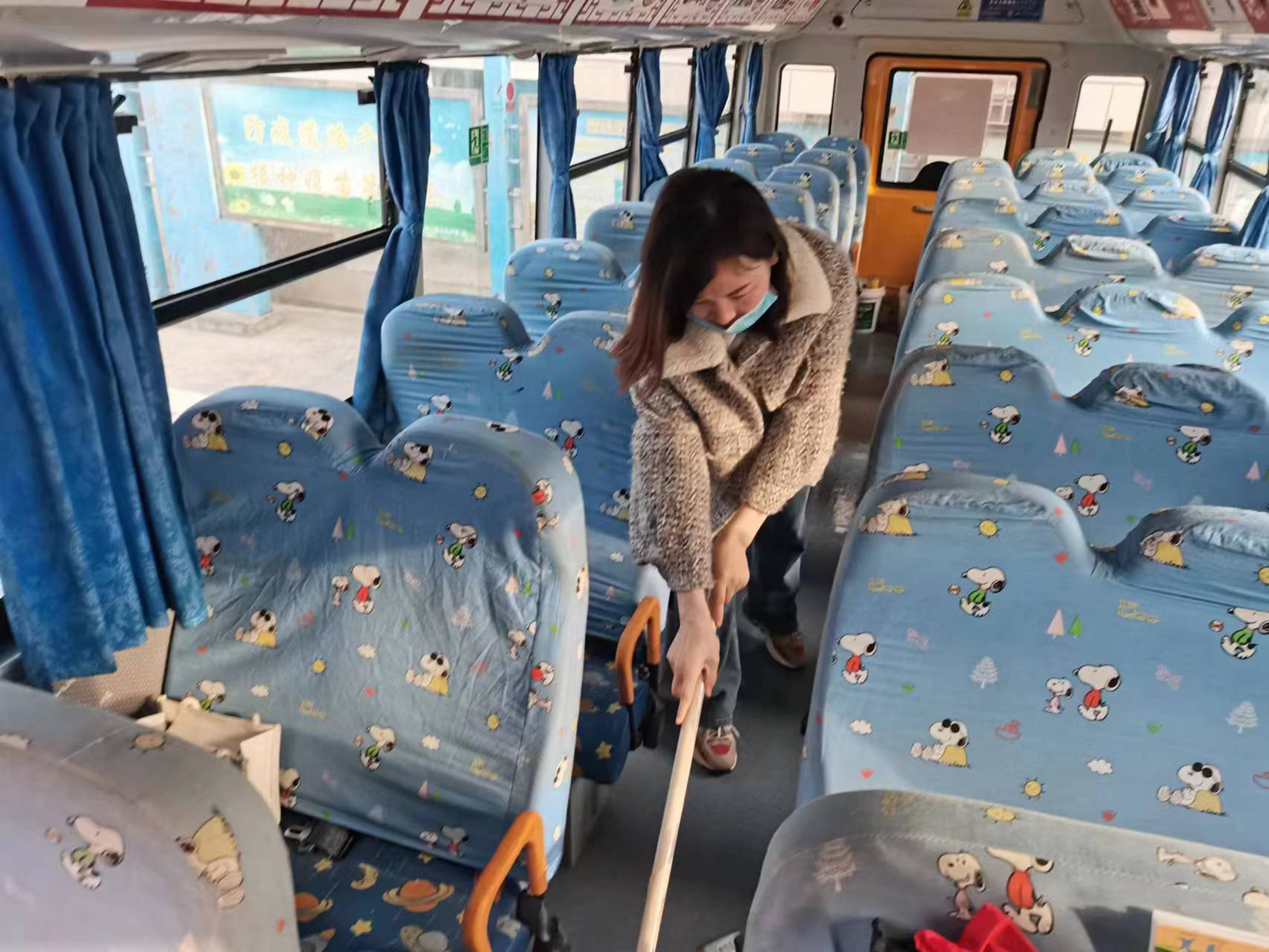 学生全部送达后,照管员立即巡视车厢是否有未下车的学生,是否有遗漏物品,随后对校车进行二次清洁、消毒,尤其是座椅、车窗、扶手等接触频率高的区域,保障车内卫生洁净。