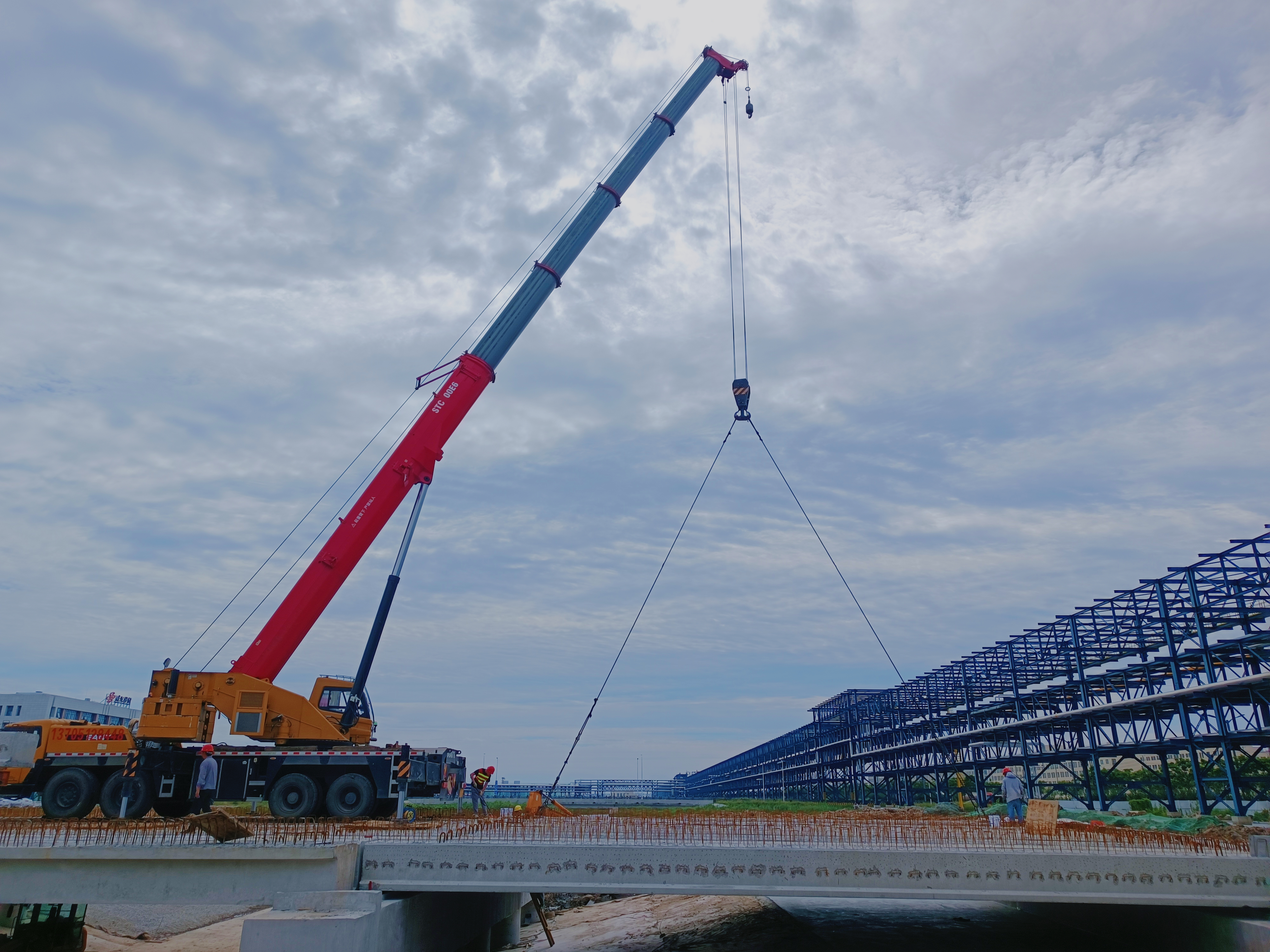 9月5日,在徐圩新区荣泰仓储西侧道口接线道路与桥梁新建工程现场,随着最后一片板梁的成功运输安装,该项目的66片板梁架设工作全部完成,标志着项目正式进入桥面系施工阶段,工程整体进度进入了最后的冲刺阶段。