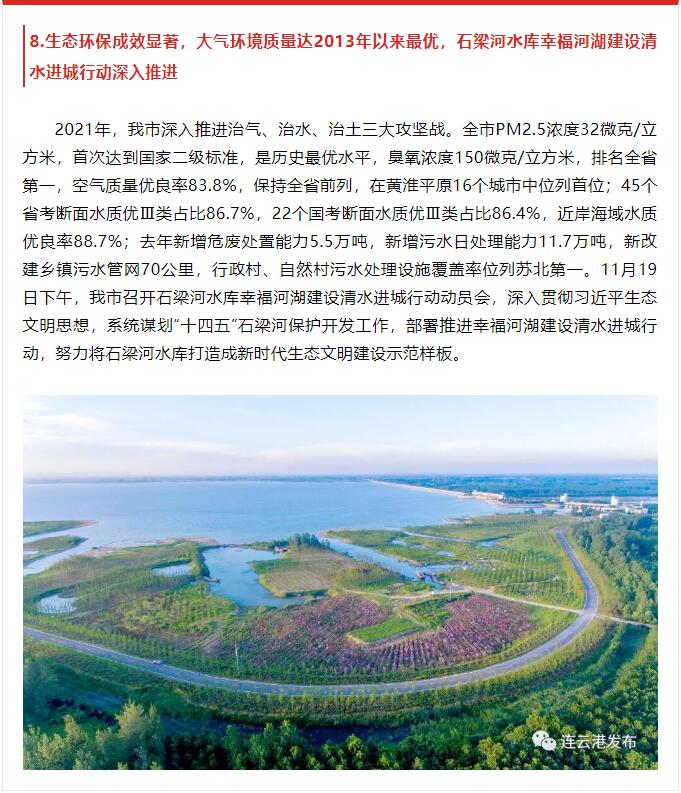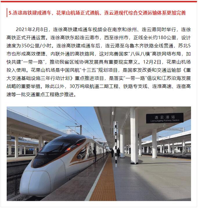 2月8日,由中共连云港市委宣传部主办,连云港报业传媒乐鱼app最新版下载,乐鱼(中国)、连云港广电传媒乐鱼app最新版下载,乐鱼(中国)承办的2021年度连云港市十大新闻评选揭晓,其中,第5条“连徐高铁建成通车,花果山机场正式通航,连云港现代综合交通运输体系更加完善”和第8条“生态环保成效显著,大气环境质量达2013年以来最优,石梁河水库幸福河湖建设清水进城行动深入推进”均与交通乐鱼app最新版下载,乐鱼(中国)相关。原文如下:
