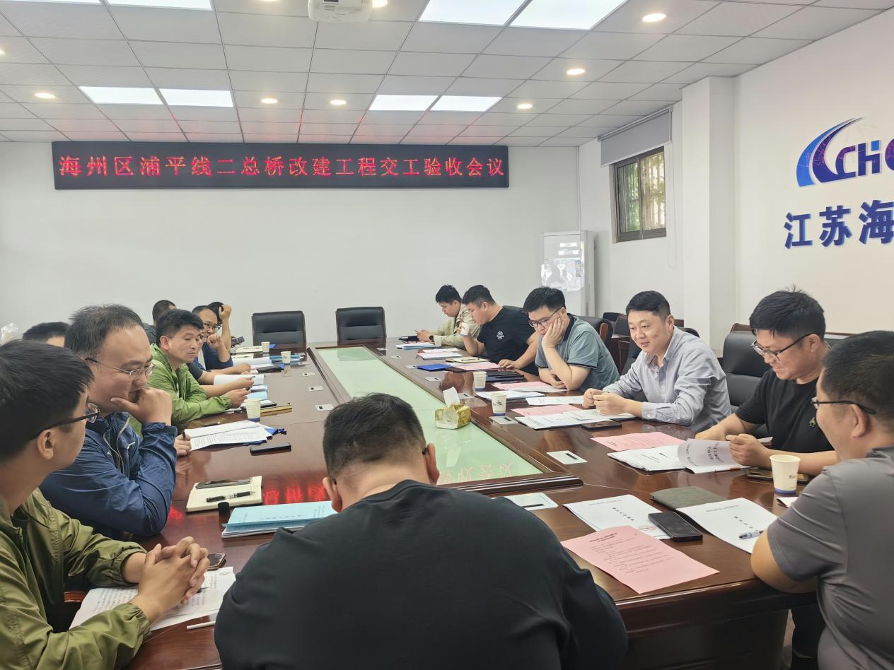 近日上午,在江苏海建公司会议室召开海州区浦平线二总桥改建工程交工验收会议。会议由连云港市海州交通建设投资有限公司组织,海州交通局、科晶有限公司、江苏苏信、浦南镇政府等参建单位参加会议。