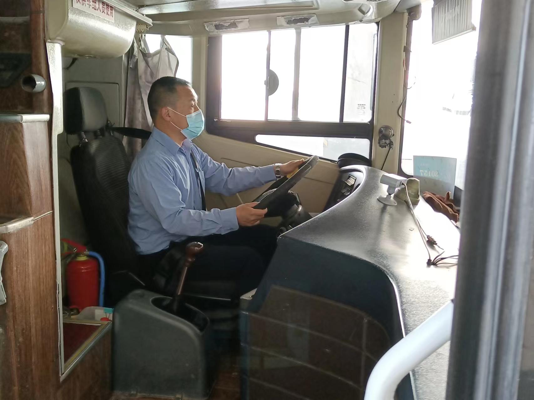 清晨4点30分,尚明早早起床,提前来到停车场,开始进行发车前的安全检查,轮胎、水箱、机油……随后,又拿起拖把、笤帚认真打扫起车辆,受疫情影响,每次车辆的消毒保洁工作尚明都做得十分仔细,特别针对乘客接触较多的扶手、座椅等部位进行重点消毒,随后打开车窗,让车厢通风。消毒后开始一天的工作,尚明将车辆开到乘车地点迎接员工上下班。