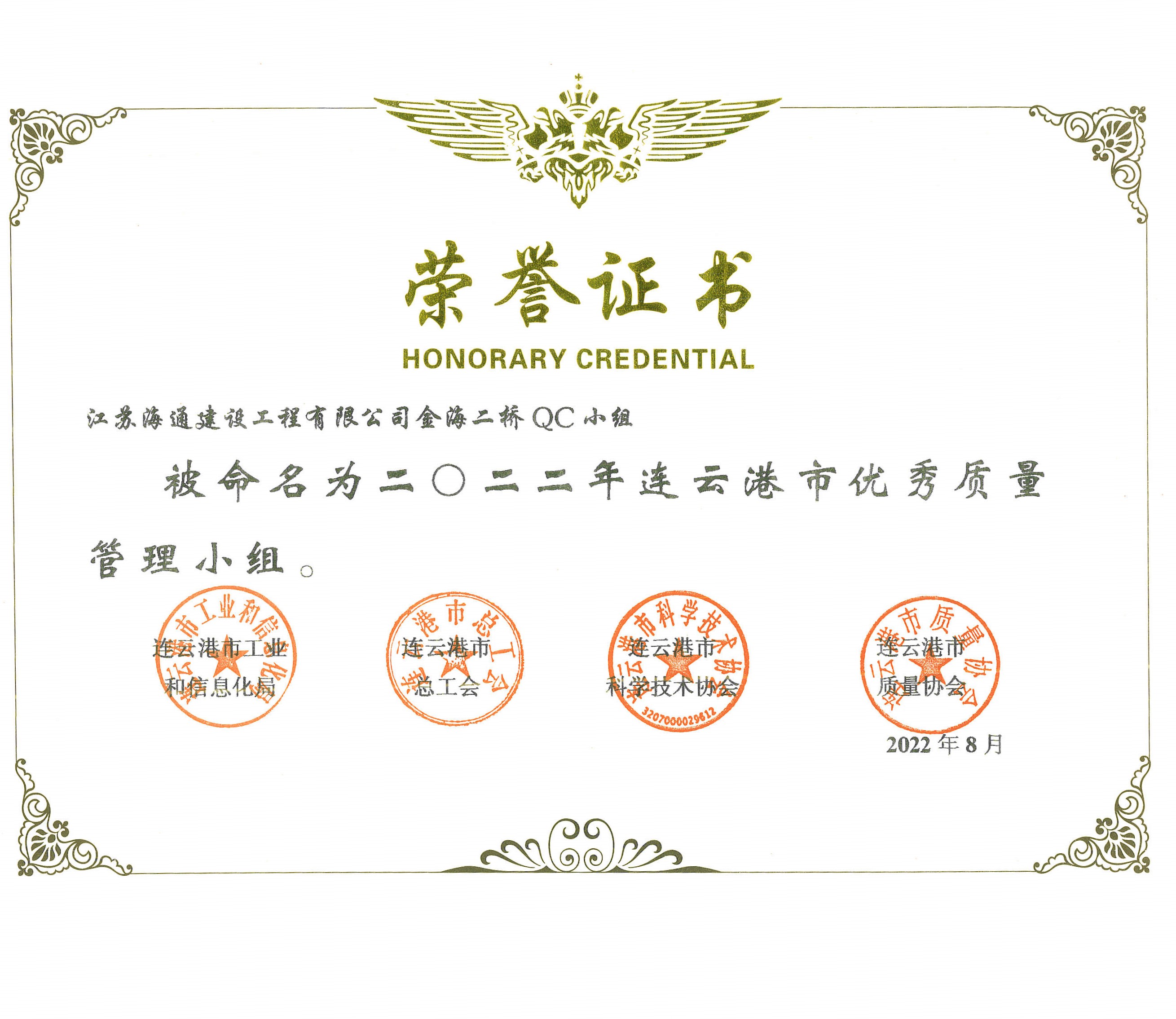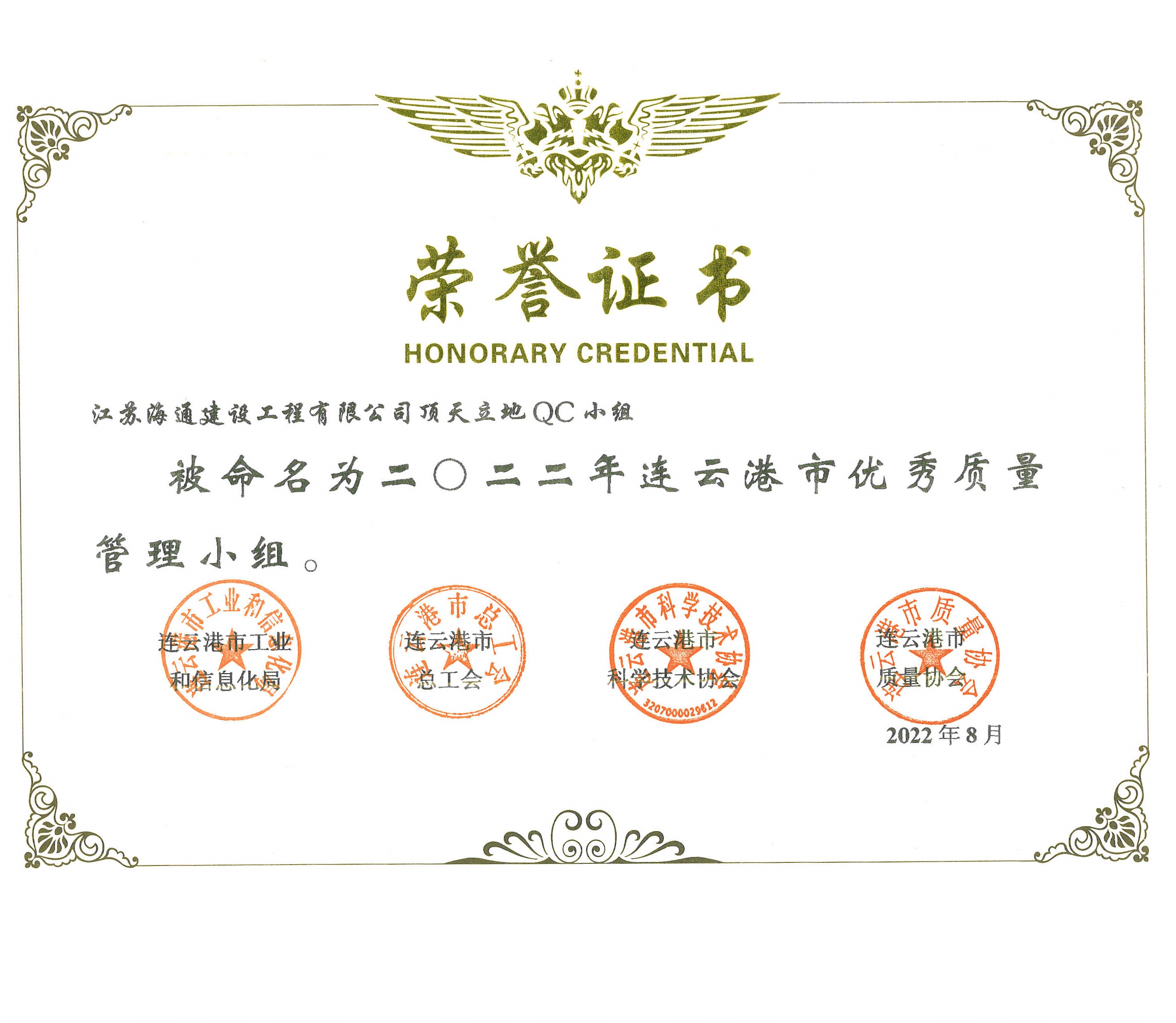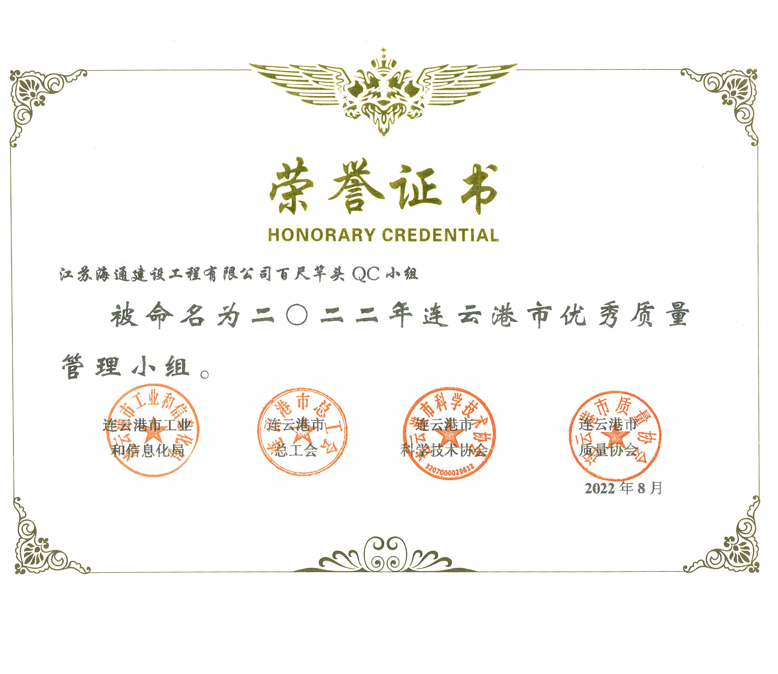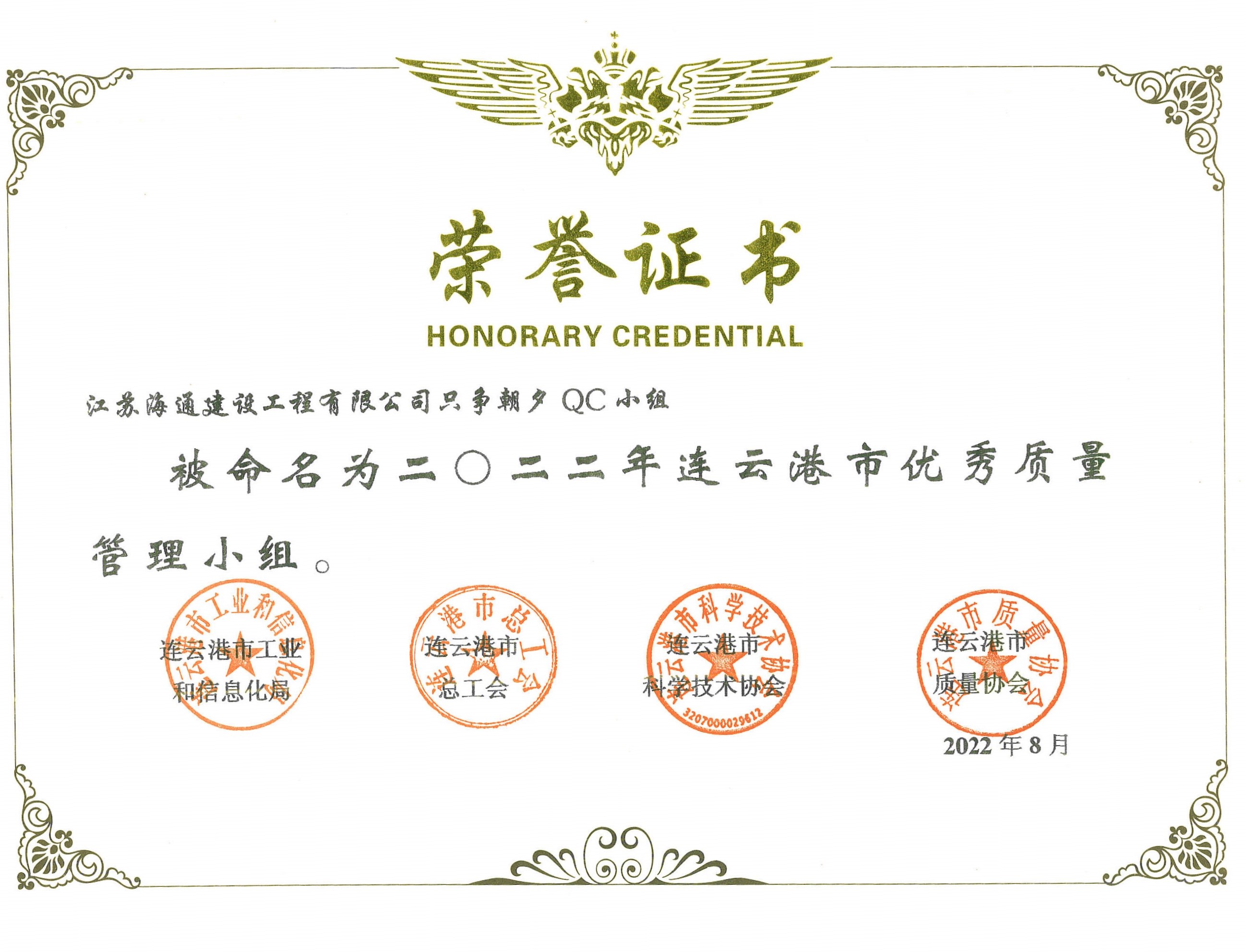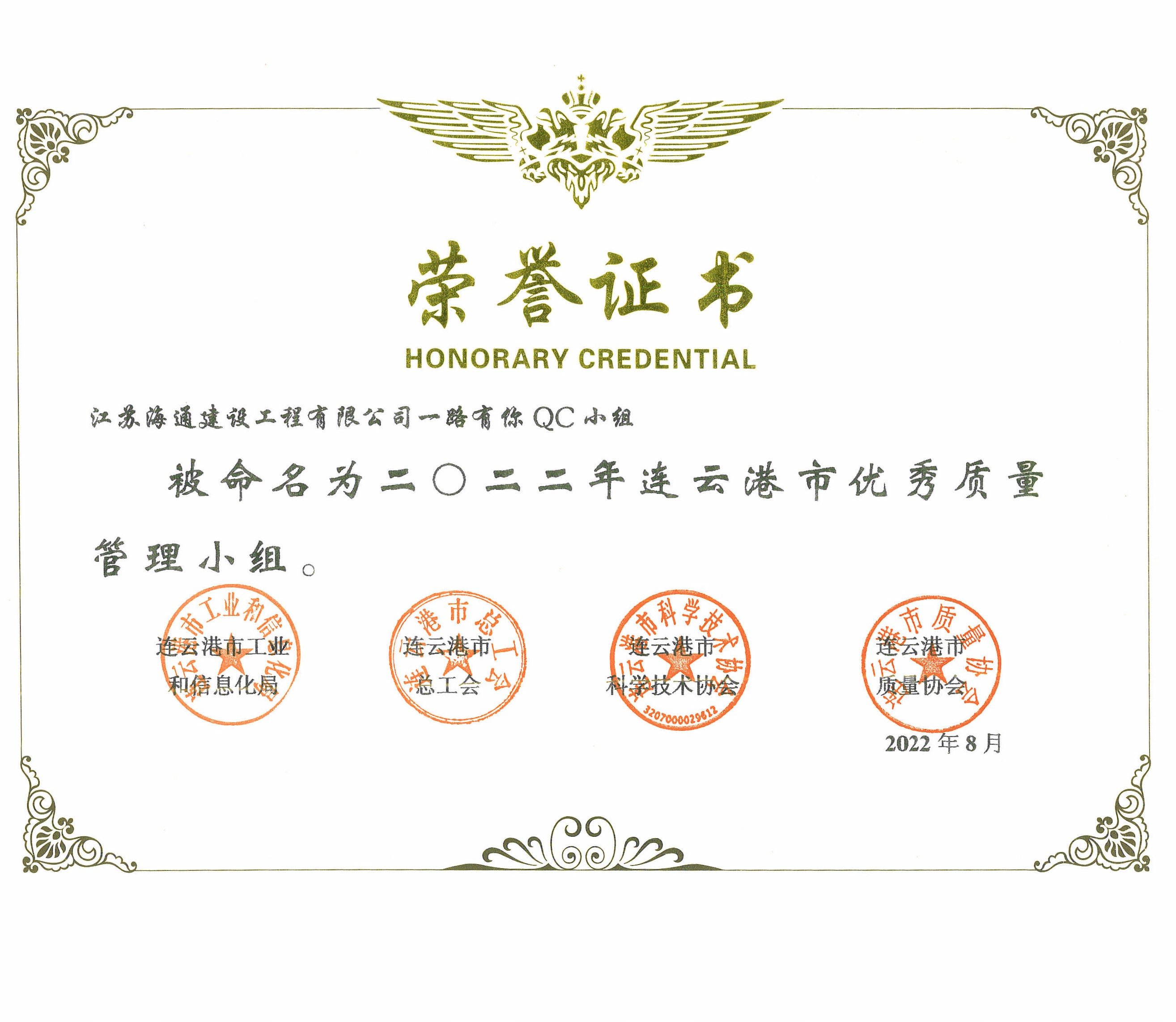 日前,从连云港市质量协会获悉,江苏海建公司参评的百尺竿头、顶天立地、金海二路、一路有你、只争朝夕五个QC活动小组均获得“2022年度连云港市优秀质量管理小组”称号。