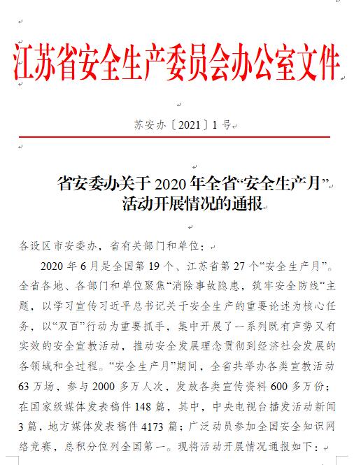 近日,乐鱼app最新版下载,乐鱼(中国)获得了由江苏省安全生产委员会授予的“2020年江苏省‘安全生产月’活动先进单位”荣誉称号。