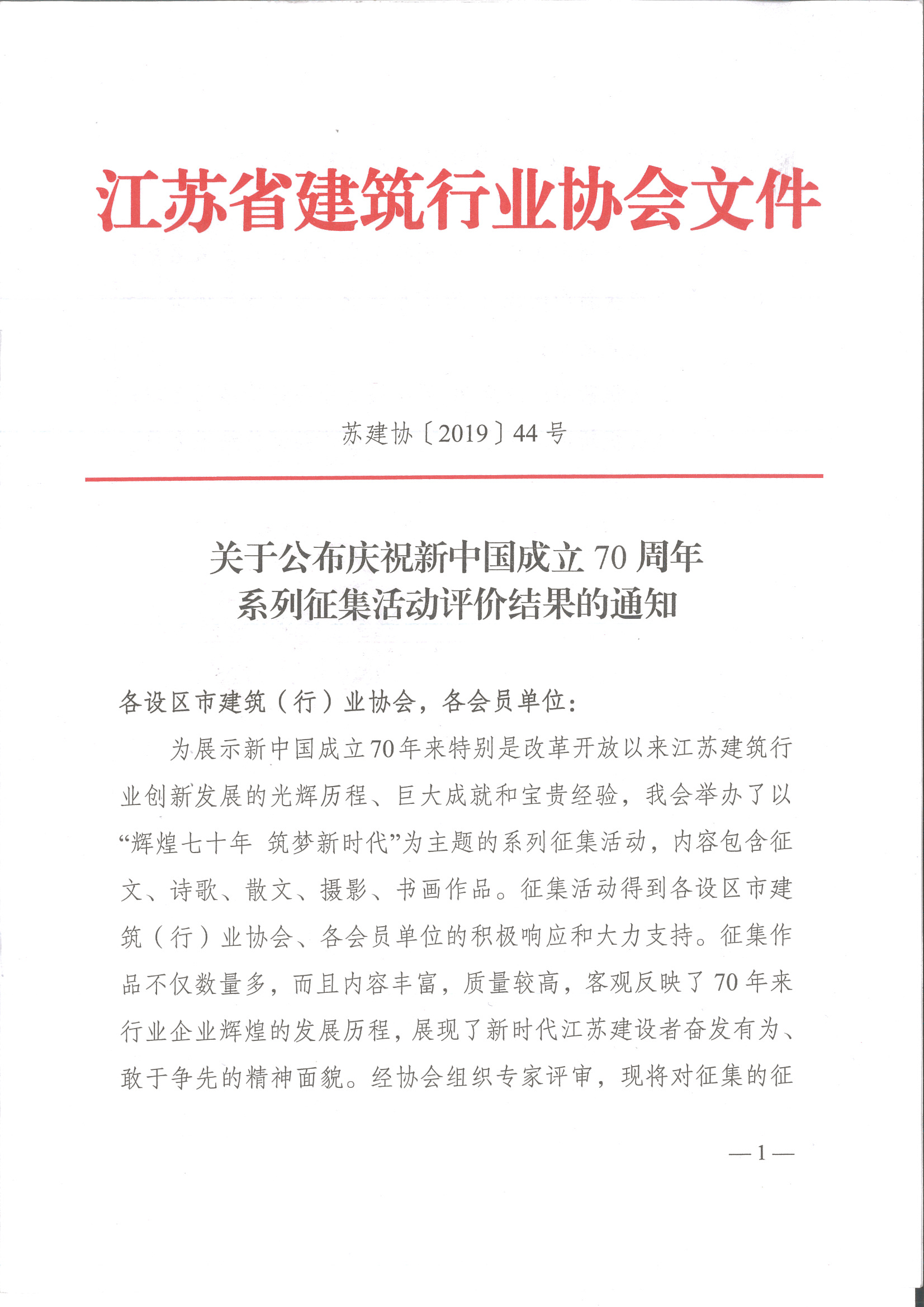 日前,从江苏省建筑行业协会《关于公布庆祝新中国成立70周年系列征集活动评价结果的通知》(苏建协【2019】44号)文件获悉,江苏海通建设工程有限公司的作品《培育和聚集创新要素 高质量推进公司发展》荣获征文作品三等奖。