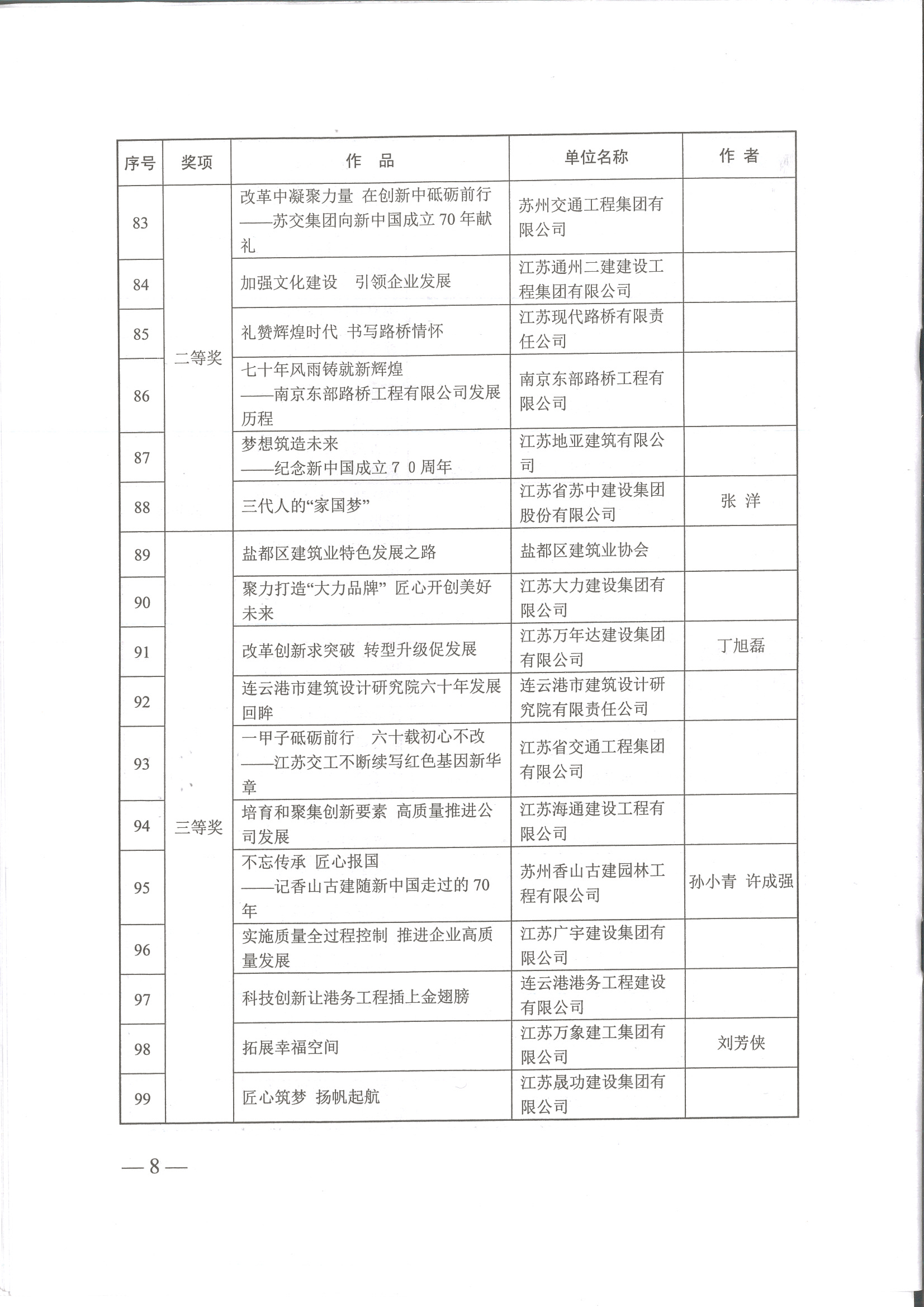江苏省建筑行业协会为全面展示建国70年来特别是改革开放以来江苏建筑行业创新发展的光辉历程、伟大成就和宝贵经验,在2019年6月-8月期间举办了以“辉煌七十年 筑梦新时代”为主题的作品征集活动,经过专家评审组的层层筛选评审,江苏海建公司的征文作品《培育和聚集创新要素 高质量推进公司发展》获得了专家组的一致好评。此篇文章主要围绕本企业近年来作为国有企业高质量发展的做法与举措,在发挥公司品牌、资质、技术、管理等优势,不断提升省内、省外和国外三大市场竞争力,坚持创新引领,全面加强风险防控,夯实基础管理,持续强化干部人才队伍建设等方面做了综合评价研究,为全省建筑业高质量发展提供更多的借鉴与参考。