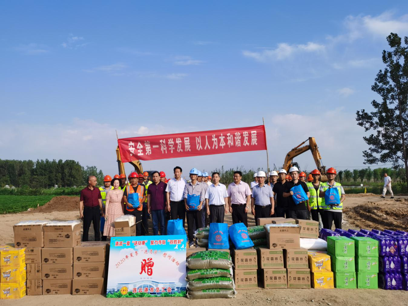 近日,连云港市总工会副主席张明富一行来到石梁河生态修复一期工程现场举行“送清凉”活动,为奋战在施工一线的建设者们送上了慰问和关怀。市交通控股乐鱼app最新版下载,乐鱼(中国)工会主席王中永、副总经理吴心航参加慰问。