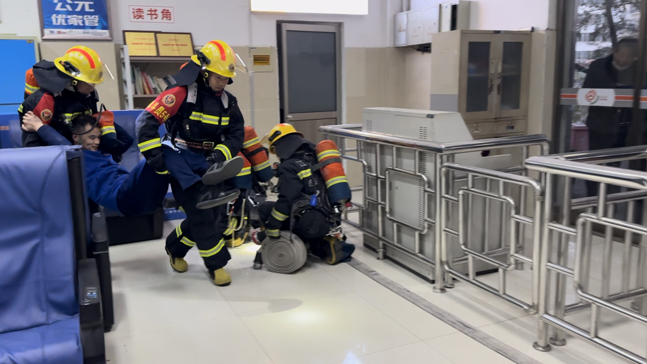 在演练开始前,消防队员向车站工作人员介绍了消防安全知识和疏散逃生的基本常识,并现场演示了灭火器的使用方法和消防应急逃生设备的操作。